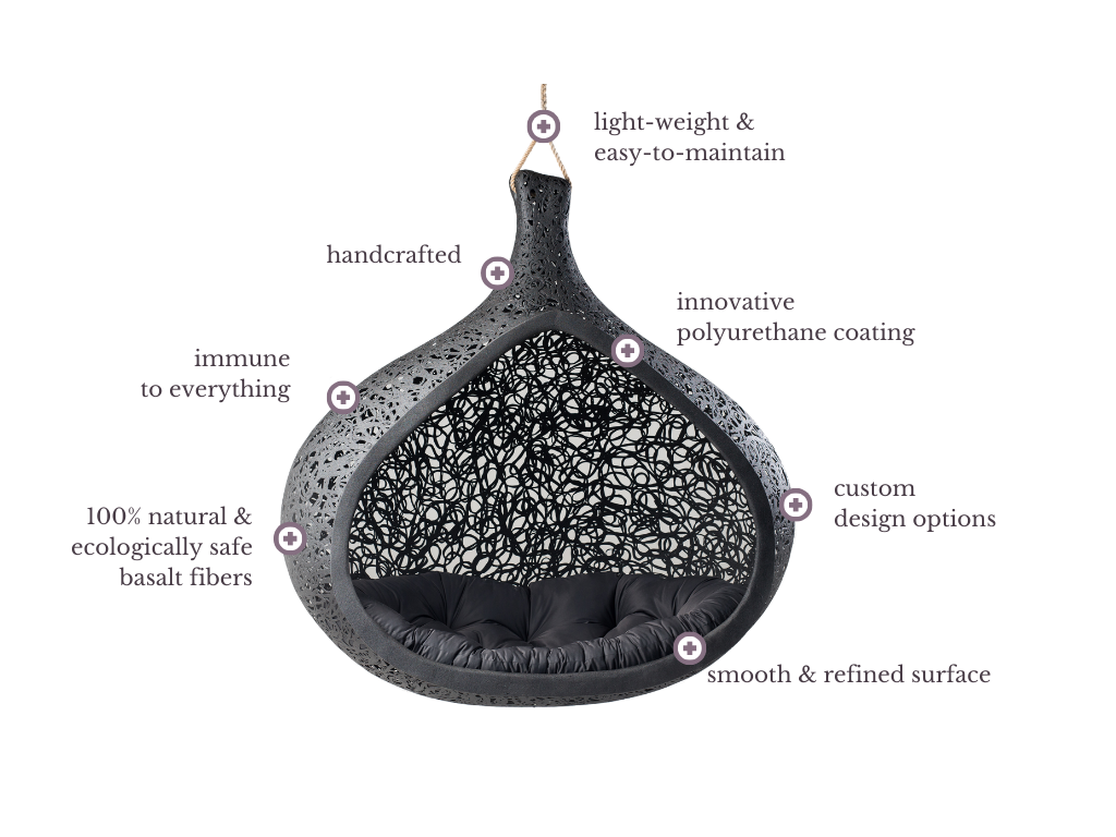 Retreat to your sacred space, listen to bird songs or your preferred podcast, taste your favorite snack, stroke your pet and smell the aroma of your sweet home, surrounded with beautiful silhouette of powerful basalt threads.